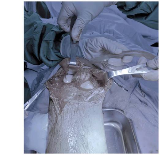 Hình 3. Vết thương gối bị cưa máy cắt ngang.