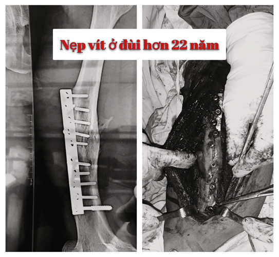 Hình 4. Tháo nẹp vít xương đùi sau hơn 22 năm ở bệnh nhân.